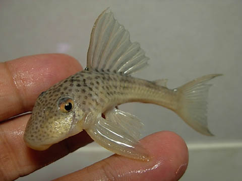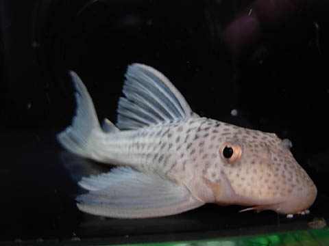 個体によりこげ茶っぽい感じのものもいるが、基本的には薄いグレーに細かい黒いスポット。 尾びれに白いエッジが入るのが特徴です。