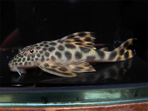 全体的にスレンダーなイメージのあるプレコです。 最大サイズは20cm強ぐらいで、Wels Atlas 2に記載されている適性水温は26〜30度です。 背びれに黄色が濃く入る物やオレンジ色っぽく入る個体もいます。
