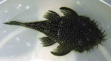 マツブッシーの背中にそのまま白く小さなスポットの入れたようなプレコが、後にシングーで発見されました。 スターライトマツブッシーです。 ブッシープレコの黒くて地味なイメージを払拭し、奇妙な美しいブッシープレコとしてブレイクしました。 今も人気種です。