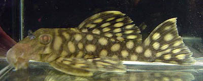 グレーの地色にボヤーッとした薄めの少々大きめのスポットが入るプレコです。 最大サイズは十数センチです。 稀に、非常にはっきりとスポットが綺麗に出るもの(ロイヤルスポットグローボ)もいます。