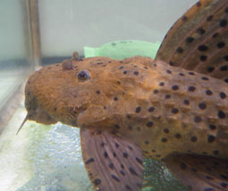 プレコファンには古くから知られている灰色〜薄オレンジボディーに黒いスポットの入るトゲの目立つプセウドカンティクスです。 大物になるとサボテンを感じさせるようなトゲトゲの体になります。