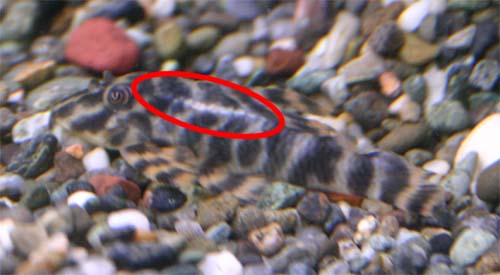 プレコは特定の場所を縄張りにして隠れる習性があります。 この「特定の場所」がムキ出しのヒーターの下であったりするとプレコの体の一部が長時間ヒーターに接してしまい、火傷をしてしまいます。 以下の写真はヤケドをしたプレコの例です。
